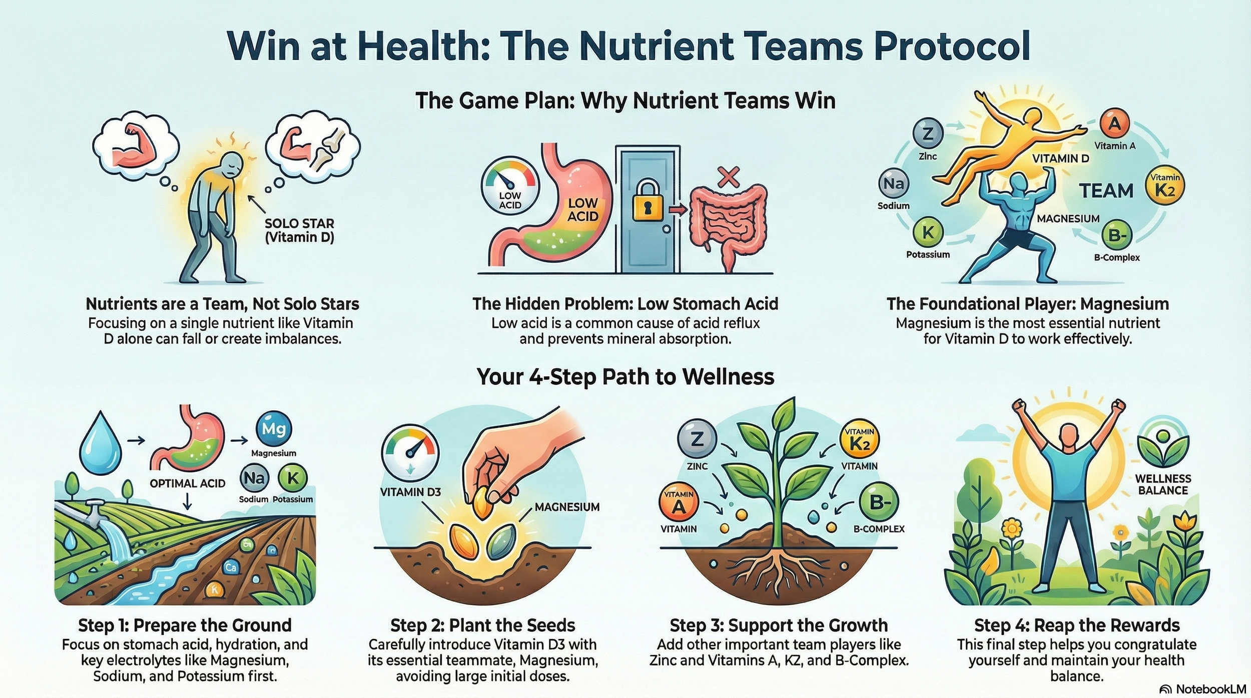 Our special program helps you take charge of your health journey, with your doctor as your teammate, not the boss. We teach you how to use nutrients together, like a team, because they work better that way. Just like in sports, you need more than just a single star player to win the game!